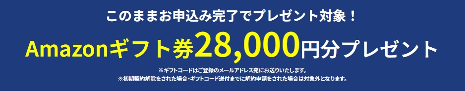 Amazonギフト券28,000円分還元は、契約の6ヵ月後に28,000円分のAmazonギフト券がもらえるキャンペーンです。