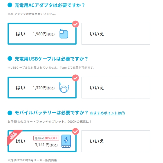 付属品の購入にあたって、付属品には補償オプションが適用されないため、修理は自己負担になる点にご注意ください。