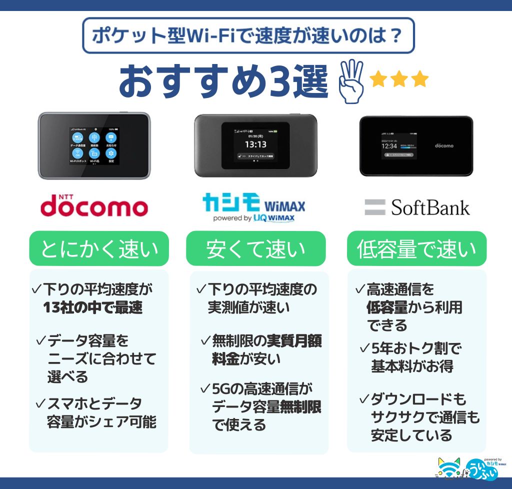 実測値が速く、おすすめのポケット型WiFiは以下の3社です。
