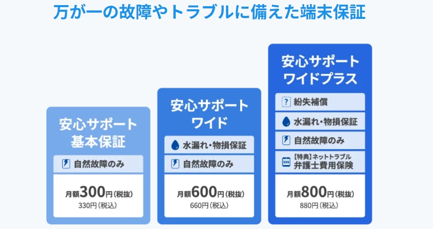 なお、申し込み時のみ加入が条件の「端末補償(安心サポート)」は、契約途中での再加入、またはアップグレードはできませんので注意してください。