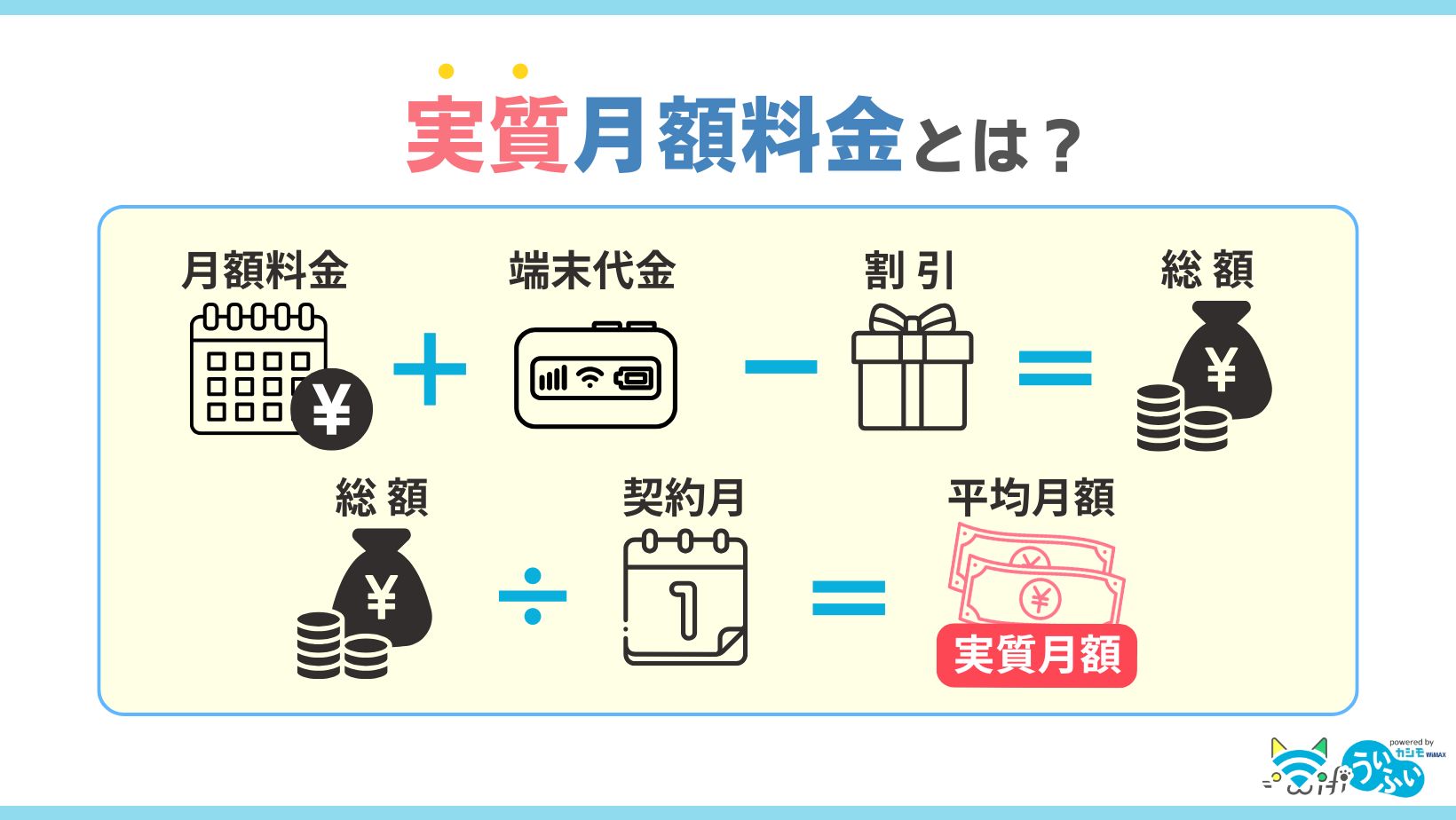 実質月額料金とは、月額料金や端末代金などからキャッシュバックを差し引いた実際にかかる費用のことです。計算式は以下のようになります。