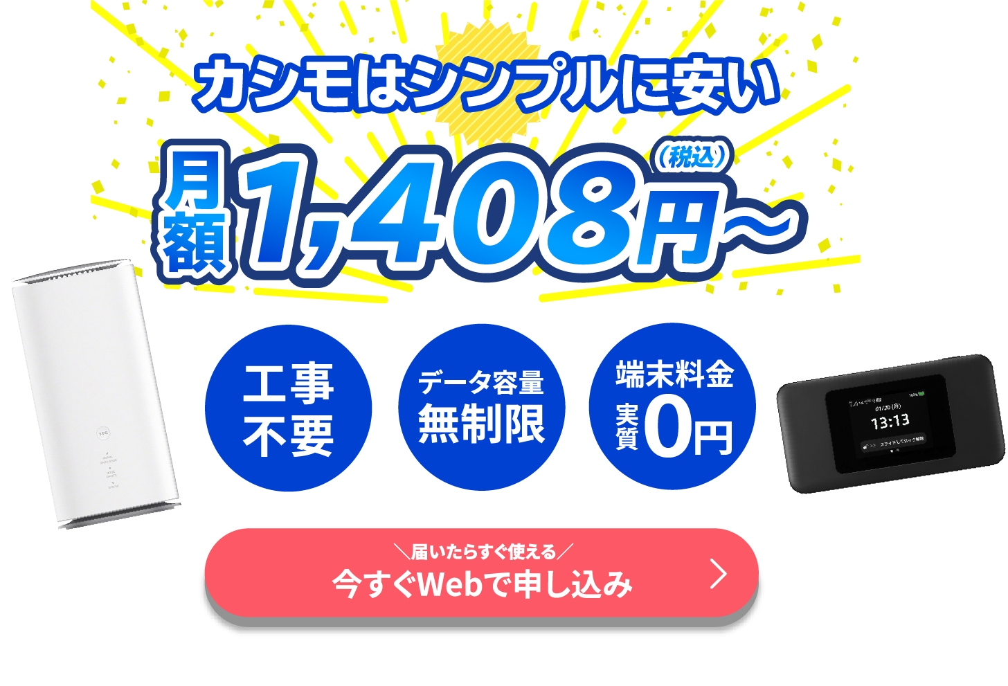 「カシモWiMAX」はカシコくシンプルに安く、ずーっと変わらない月額料金が特徴のモバイルwifiサービスです。