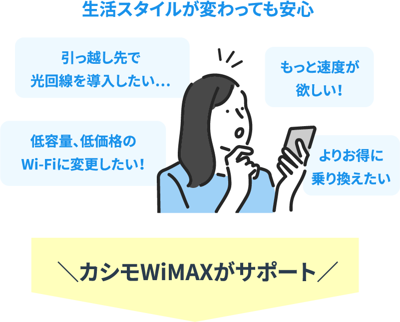 「カシモWiMAX」はカシコくシンプルに安く、ずーっと変わらない月額料金が特徴のモバイルwifiサービスです。