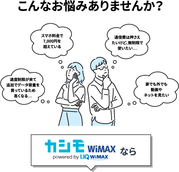 「カシモWiMAX」はカシコくシンプルに安く、ずーっと変わらない月額料金が特徴のモバイルwifiサービスです。
