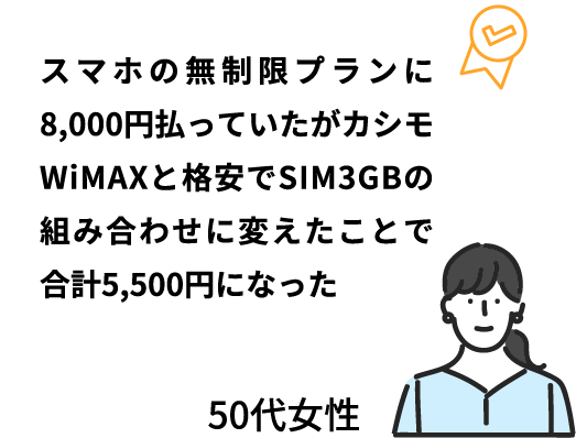 スマホの利用料が(GB使い放題)4500円程だったのがカシモWiMAXを利用することによって2000円ほどに減らすことができた。